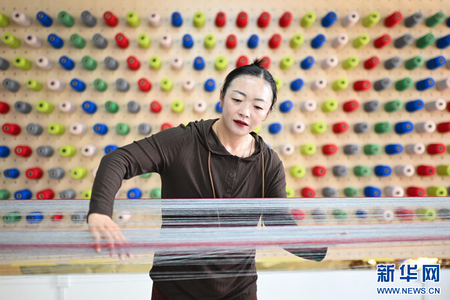 2024年7月19日。在青海省果洛藏族自治州玛沁县久美家园的“沪沁怡”氆氇手工编织坊内,工作人员卓玛杰在梳经,该工坊由上海援青团队打造。新华社记者 张龙 摄